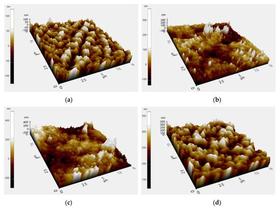Atomic force microscopy (AFM) three-dimensional surface micrographs of (a) neat PVDF membrane and PVDF membrane immersed in a coagulation bath with different types of TiO2 at a concentration of 0.01 g/L, (b) PC-20, (c) P25, (d) X500.