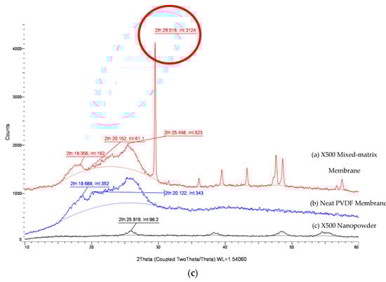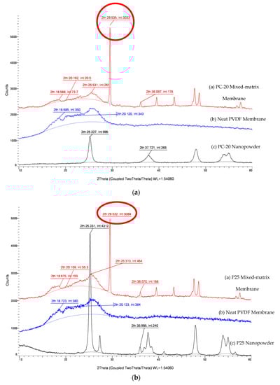 The results in Figure 5 reveal that a prominent and distinct polymorphic change is observed after the inclusion of TiO2 nanoparticles in the neat PVDF membrane. The crystal planes associated with the characteristics of an α-polymorph of the PVDF membrane at 29.5°, which was close to the literature value of 27.6° from Dillon et al. [45] and Buonomenna et al. [46], deviated higher with the addition of TiO2 nanoparticles. The intensities of the α-polymorph peaks varied among the TiO2 MMMs, with the lowest value observed for PC-20. This reading is consistent with the calculations done earlier whereby PVDF-PC-20 has the lowest attractive free energy among the mixed-matrix membranes (MMMs).