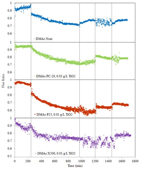 Accordingly, PVDF/TiO2 MMMs with homogeneous distribution of X500 nanoparticles displayed the best membrane water permeability, suggesting that X500 (fully anatase) possesses the most hydrophilic behaviour compared to the other membranes, and would be best suited to mitigate the fouling effects when operating with HA solution. This mitigation is attributed to higher permeability towards water molecules due to increased adsorption sites (a function of the nanoparticles’ surface areas) towards water molecules, which is promoted by the homogenous dispersion of X500 nanoparticles [47].