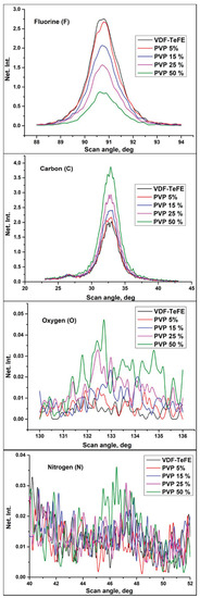 Figure 2 shows the typical fluorescence spectra of the investigated samples for the following elements: carbon (C), oxygen (O), fluorine (F), and nitrogen (N). The chemical composition of the VDF–TeFE membranes without PVP was mainly represented by carbon (C) and fluorine (F), which are major elements in VDF–TeFE backbone. Low amount of oxygen (O) may be attributed to the presence of residual DMF used as a solvent for the preparation of the spinning solutions (Table 2).
