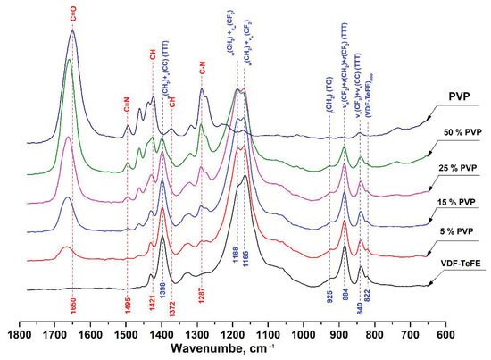 FTIR spectra of composite VDF–TeFE/PVP membranes with different PVP contents.