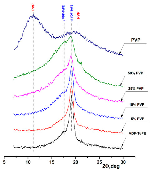 The XRD patterns of the formed membranes are shown in Figure 4. The XRD pattern of the pure PVP shows two wide characteristic halo peaks located at 10.9° and 20.5°, corresponding to the amorphous PVP [36]. An intensive peak at 19.2° on the XRD pattern of the membranes formed from the VDF–TeFE copolymer corresponded to the most electrically active ferroelectric β phase of the VDF–TeFE copolymer formed by macromolecules in TTT conformation [37,38]. At the same time, a halo associated with the formation of an electrically active γ phase formed by macromolecules in the T3GT3G- conformation could be observed at 17.8° [39,40]. The formation of electrically active crystalline phases is associated with the high intensity of the electric field between the injector and the collector, high tensile forces from the electric field in the process of the membranes formation [41], and the alignment effect of TeFE segments on the PVDF macromolecule [42]. With an increase of the PVP content, the half-width of the β phase peak increased from 0.784° for the pure VDF–TeFE membranes to 1.952° for the VDF–TeFE membranes containing 50% PVP. The intensity of the halo reflection at 17.8° also increased, indicating difficulties of the electrically active β phase crystallization process in the VDF–TeFE copolymer. It can be attributed to the penetration of PVP molecules into the VDF–TeFE structure and the formation of significant transition layers formed as a result of tensile forces from the electric field.