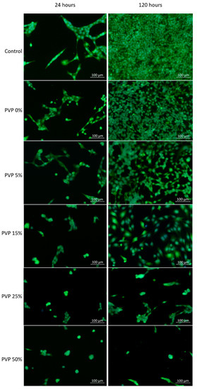The decrease in adhesion and proliferation of fibroblasts with an increase in PVP content may be due to the following reasons. PVP is a water-soluble, hydrophilic polymer. Thus, PVP can diffuse into the culture medium [44]. The amount of PVP released into the culture medium over a certain period of time is determined by the content of PVP in the sample. It is known that PVP is protonated in aqueous solutions and can form complexes with anions, including various biologically active molecules [45]. Thus, an increase of PVP content may lead to an increase in the content of complexes with biologically active anions in the culture medium, changing its chemical composition and reducing the availability of anions for cells. On the other hand, diffused PVP in the culture medium can lead to its accumulation in cells causing “lysosomal storage disease”, which inhibits the processes of vital activity of cells causing their death [46]. The third possible reason for a decrease in cell viability on the surface of membranes with a high content of PVP is the process of its leaching from fibers, leading to membrane deformation which prevents cell attachment to the membrane surface [46]. The fourth reason could be the formation of toxic complexes between PVP and DMF during the spinning solution preparation, followed by its migration into the culture medium, which is indirectly evidenced by an increase in the concentration of DMF in the formed membranes with an increase in the concentration of PVP (Table 2).
