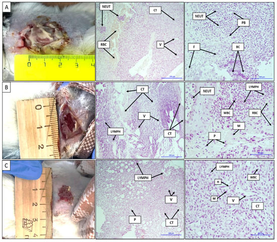Images and histological sections of the contaminated full-thickness wound (A), the wound treated with a gauze dressing soaked in a chlorhexidine solution (B), and the wound treated with the VDF–TeFE membrane containing 15 wt % PVP on the 7th day (C). V: vessels, H: histiocytes, NEUT: neutrophils, WBC: leukocytes, RBC: erythrocytes, CT: connective tissue, LYMPH: lymphocytes, M: macrophages, P: plasma cells, F: fibrin, purulent bodies (PB): purulent bodies, bacterial colonies (BC): colonies of bacteria. The bars correspond to 200 μm.