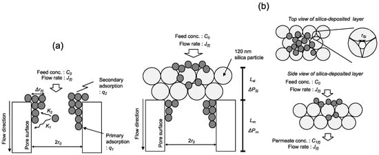 Here, a suspension of 120-nm silica particles was permeated through a polyethylene (PE) microfiltration membrane to deposit a silica layer on the membrane pores. Then, a poly(N-isopropylacrylamide) gel and dextran solution (2000 kDa), with 50-nm particle sizes, was permeated through the membrane to examine the filtration and adsorption efficiency. Permeated silica particles form a silica layer on the membrane surface (creating a “silica-deposited” membrane). The filtration flux and the amount of adsorbed particles in the silica-deposited membrane was mathematically evaluated with Nakamura’s model [,]. A polarization model [], a filtration resistance model [], and a blocking model [,,] have been studied. The novel mathematical model here includes adsorption coefficients on the silica-deposited layer and the PE membrane, and multilayer filtration by the PE membrane. The model quantifies the adsorption coefficients and the maximum amounts adsorbed to determine adsorption, filtration, and the filtration flux from the obtained parameters.