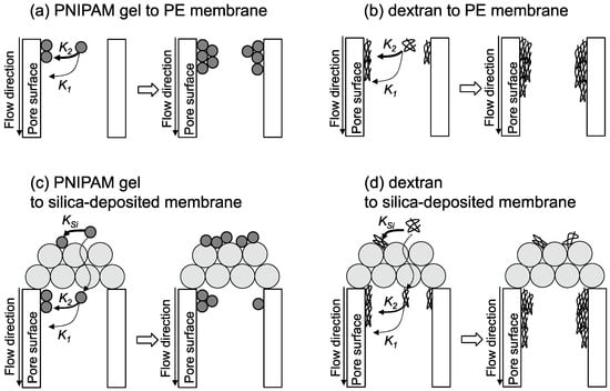 Based on the above analysis, schematics of PNIPAM gel and dextran filtered by the PE and silica-deposited membranes are shown in Fig. 6. In the case of filtering by the PE membrane (Figure 6a,b), linear dextran adsorbs to the pore surfaces by multi-point interaction. PNIPAM gel filtered by the size-exclusion effect could occupy the pores and the interaction with the pores occurs via entanglement because the K2 of PNIPAM gel had a high value. In the case of filtering by the silica-deposited membrane (Figure 6c,d), the PNIPAM gel would be primarily filtered by the silica-deposited layer, but the dextran would pass through because of deformation of the globule to a linear structure. Some dextran would be adsorbed by the PE membrane. Dextran filtered by the silica-deposited layer would fill gaps in the layer and reduce the flux. Nanoparticle at the smaller size could be deposited on the membrane with the smaller size, such as ultrafiltration. The analysis proposed by this study is applicable layer of the modified silica can be used for the separation and reaction media.