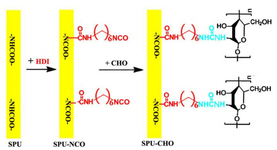 Segmented polyurethanes (SPUs) have been extensively used as biomaterials because of their superior tensile properties and adequate biocompatibility [1,2,3,4]. They are not only used in the manufacturing of chronic implants, but also have promise for bone implants and orthopedic due to the suitable processability, high flexibility, and bio-adhesion properties [5,6,7,8]. However, inflammatory mechanisms and wound healing could be elicited by the existence of a foreign matter in a physiological environment [9]. The main reason for the failure of implantable medical devices is the quick aggregation of proteins on the material surface and the occurrence of subsequent responses, such as platelet coagulation and activation [10]. Nowadays, improving the biocompatibility of SPUs is a widespread concern. Surface modification methods, especially surface grafting, have been investigated to prevent biofouling and polish up the biocompatibility for biomedical applications [11,12,13,14]. By producing a non-fouling surface coating, the surface can be protected from the nonspecific protein coating to make the device “stealthy”. Natural biopolymers will not induce any toxicity or adverse response because of their excellent biocompatibility. In addition, they are biodegradable and can be metabolized completely after use [15,16]. Thus, the natural biopolymers are developed as biomaterials to replace or restore a function of the body while in contact with the body fluids.