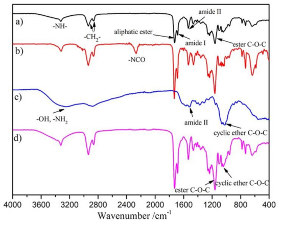 FT-IR spectra of (a) SPU, (b) SPU-NCO, (c) CHO (powder) and (d) SPU-CHO films.