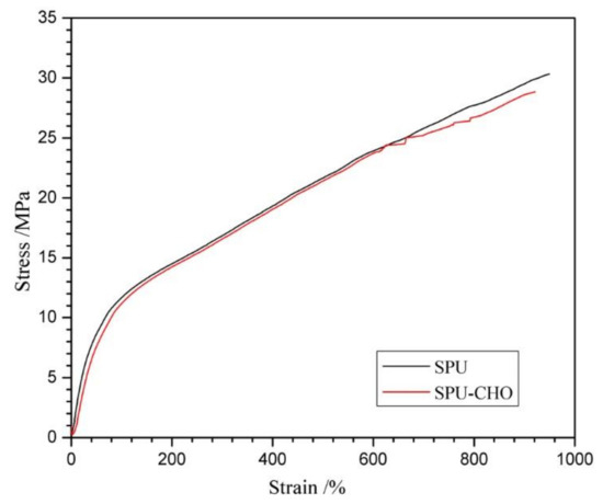 Typical stress vs. strain curves for SPU and SPU-CHO films.