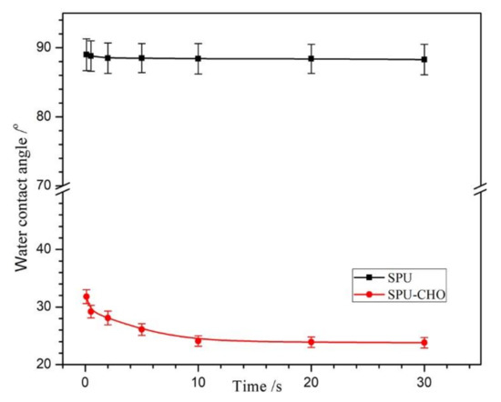 The surface biocompatibility was affected by surface hydrophilicity to a certain degree [31]. The surface hydrophilicity of the SPU and SPU-CHO films were investigated by a WCA test [32,33], and the time dependence of WCA is exhibited in Figure 4. The blank SPU had a hydrophobic surface with a high WCA of 87.4°, while the WCA on the CHO covered surface (SPU-CHO) decreased to 23.8°, indicating that the surface hydrophilicity was improved substantially. In additional, the WCA on SPU surface needed much shorter time to reach the steady value than that on SPU-CHO surface. It should be ascribed to the hydrophilic hydroxyl groups and unreacted amine groups of CHO exposed on the surface, which could bind water molecule to form a hydration layer through hydrogen bonds. It was further evidence that the CHO was grafted onto the surface, which was conducive to improve the surface biocompatibility.