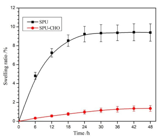 The time dependence of water uptake of SPU and SPU-CHO film at 37 °C in deionized water (n = 3).