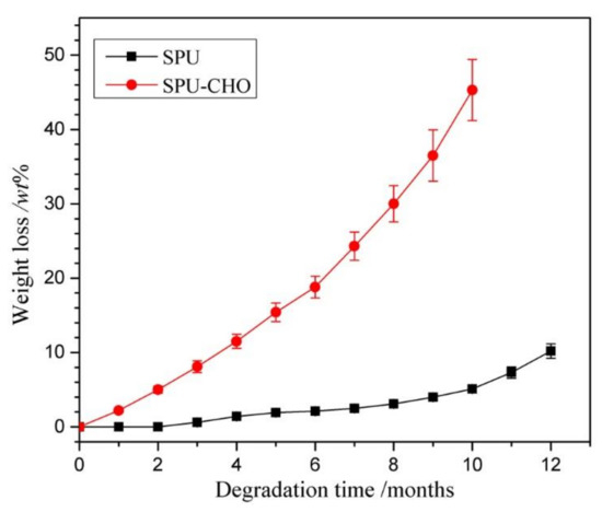 Considering the temporary biomedical application, the implant biomaterials should possess biodegradability. PBS (pH = 7.4) was selected to simulate the physiological microenvironment, in which the in vitro degradation of blank and modified films was carried out to assess the influence of surface-grafted CHO on the biodegradability of the substrate. The data expressed the percentage weight loss of the SPU and SPU-CHO films with time are exhibited in Figure 6. The blank SPU film showed a very slow degradation rate with less than 2% weight loss after six months of degradation and only 11% weight loss until the end of the measurement. While the SPU-CHO film displayed 18.5% weight loss at 6 months, and the film lost it original shape and became fragments at 10 months with a weight loss of 45%. The result indicated that the degradation rate of SPU-CHO film was much higher than that of the blank SPU film. It was mainly ascribed to the hydrophilic surface-grafted CHO, which facilitated the water molecules to approach the substrate and attack the ester groups easily. The results were consistent with the water absorption described above. From the weight loss curves of in vitro degradation, the surface-grafted hydrophilic CHO was beneficial to improve the hydrolytic degradation of the substrate.