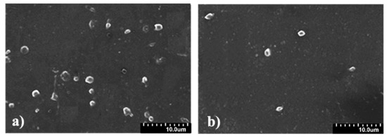 With regards to blood-contacting materials, blood compatibility is one of the most important biocompatibilities [31]. It is generally known that, when an artificial material comes into contact with blood, it results in the platelet adhesion, making the coagulation pathways active, and then facilitating thrombosis [34]. Thus, the surface platelet adhesion on the films in PBS was carried out to evaluate the blood compatibility. The typical SEM images of the SPU and SPU-CHO films are presented in Figure 7. Massive platelets adhered on the surface of the blank SPU film (Figure 7a), and part of the platelets presented shape variation. Compared with the SPU film, the SPU-CHO surface showed a significantly lower adhesion of platelets (Figure 7b), which indicated that the surface has effective inhibition of platelet adhesion—that is, better blood compatibility.