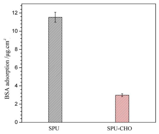 Biocompatibility of the implant material is also associated with protein adsorption because the surface-adsorbed proteins can trigger the coagulation sequence [35]. The protein adsorption response on the material surface plays a significant role in designing the biomedical devices [36]. The BSA was chosen to evaluate the protein absorption, and the quantity of absorbed BSA protein on the blank and CHO-covered surface is shown in Figure 8. Compared with the bare surface (SPU: 11.46 µg/cm2), there was a great decrease in BSA absorption on the CHO-covered surface (SPU-CHO: 2.98 µg/cm2). Obviously, the hydration layer formed on the film CHO-covered surface could produce repulsive force to protein and reduce the interaction between the protein and film surface. It was known that the adsorption of protein on the surface of the implant materials was the first step in thrombus formation [37]. Hence, the low protein adsorption capacity meant good surface biocompatibility (especially blood compatibility), making SPU-CHO material a potential candidate for in vivo biomedical applications.