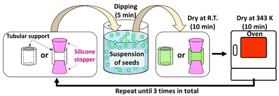 In total, 36.75 g of CH3COOH was rapidly poured into an Na2WO4 solution of 27.30 g containing 7.0 mmol of Na2WO4, under continuous agitation. Precipitates appeared immediately after CH3COOH addition, forming a suspension of seeds. Next, seeding was performed by dipping the tubular substrates into the aforementioned suspension for 5 min and subsequently dried at room temperature and 343 K for 10 min, respectively. This seeding process was repeated three times to ensure attachment of seeds on the surface of tubular substrates. In this study, two ways of seeding were tested. One is directly dipping the tubular substrates into the seed suspension as we have done in our previous study. Another is dipped into the seed suspension with both ends of the tubular substrates sealed using silicon stoppers to avoid attachment of seeds on the inner wall of the tubular substrates. The two seeding methods are illustrated in Figure 1.
