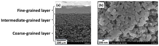 Characterization of the tubular substrate: (a) cross-sectional SEM image; (b) outer surface (fine-grained layer) SEM image.