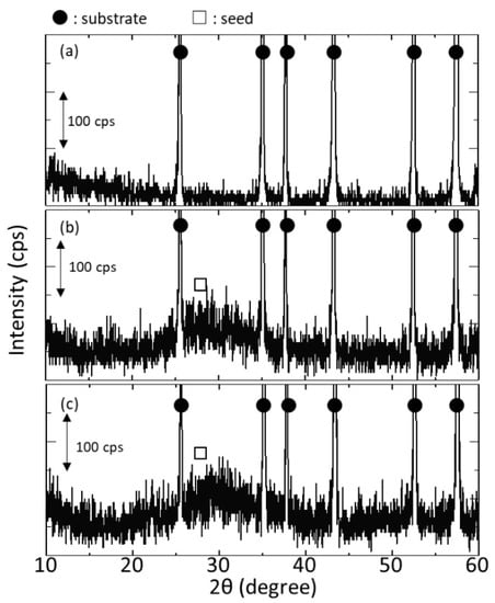 Figure 4 shows the surface SEM images of the tubular substrate before and after seeding with and without the silicon stoppers at both ends of the tubular substrate. Seeds almost cover the surface after seeding in both cases; however, the attached seed layer seemed to be thicker when using silicon stoppers. For the sample seeded without silicon stoppers, some areas showed morphology similar to the substrate surface, implying that the seed layer was relatively thin. Meanwhile, for the sample with silicon stoppers, although some cracks were observed, the surface morphology completely changed possibly due to a thicker seed layer formation. Figure 5a–c show the XRD diffractogram of the tubular substrate before seeding and after seeding without and with silicon stoppers. After seeding, a broad peak was detected between 25 to 35 degrees in both cases. This is expected to be derived from the amorphous h-WO3 seed layers, considering the XRD diffractogram of the seed shown in Figure 2c. The intensity of the broad peak was slightly stronger for the sample seeded in the presence of silicon stoppers, implying thicker seed layer formation as anticipated from the SEM image. This might be owing to the air remaining inside the tube when both ends are sealed with silicon stoppers, leading to suction and filtration of the seed solution into the substrate.