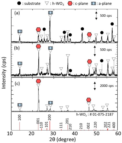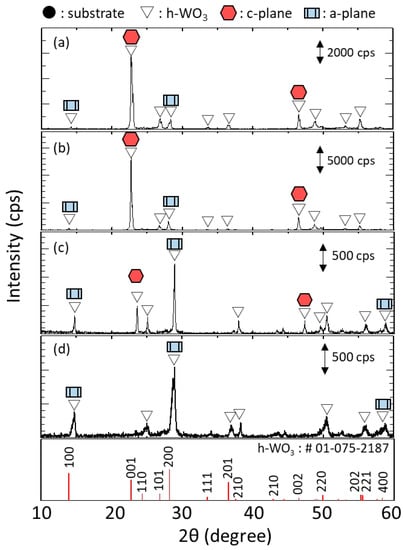 Figure 11 shows the XRD diffractograms of h-WO3 membranes synthesized using precursor sols containing 3.5, 5.0, 6.0 and 7.0 mmol of Na2WO4, respectively. Only peaks related to h-WO3 were detected and those from the substrate were not, indicating that the h-WO3 membranes without large defects formed thicker than the penetration depth of the X-ray. The peaks derived from c-plane and a-plane of h-WO3 are marked with hexagonal symbols and rectangular symbols, respectively. The membranes synthesize with 3.5 and 5.0 mmol of Na2WO4 showed obviously higher intensity of c-plane than a-plane of h-WO3 while those synthesize with 6.0 and 7.0 mmol of Na2WO4 showed the opposite trend. This matched well with the change in morphology of the membranes observed from the SEM images shown in Figure 10; i.e., change in direction of rod-like crystals from vertical to parallel to the substrate surface. This implies that an excess amount of Na2WO4 in the precursor sol has an adverse effect on the c-plane orientation of the membranes.