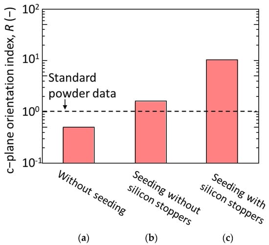 Meanwhile, when using the tubular substrates with seeding, dense membranes with thickness of more than 10 μm were formed and rod-like crystals seemed to well cover the surface of the substrate regardless of the use of silicon stoppers, as shown in Figure 6b,c, respectively. This indicates that the seeding was effective to increase the homogeneity of the membrane and promote their densification. In contrast, the appearances of the membrane surfaces were quite different when using substrates seeded without and with the silicon stoppers. The rod-like crystals stood more vertically to the substrate surface when membranes were synthesized using tubular substrates seeded in the presence of silicon stoppers. According the XRD diffractograms of the synthesized membranes, the reflection from (200) plane; a-plane of h-WO3 drastically decreased while the reflection from (001) plane; c-plane of h-WO3 drastically increased when employing tubular substrates seeded using silicon stoppers (Figure 7c). This means that the seeding method significantly affects the crystal orientation of the h-WO3 membranes. Figure 8 shows the c-plane orientation index; R of the membranes synthesized using substrates without and with seeding in the absence or presence of silicon stoppers. Seeding without silicon stoppers was found to slightly improve the c-plane orientation of the membrane; however, the c-plane orientation index is still similar to the value of the standard powder diffraction, meaning that c-plane orientation was still weak. In contrast, the c-plane orientation index increased approximately ten times when substrates were seeded with silicon stoppers, clearly evidencing the effectiveness of sealing both ends of the tubular substrate with the silicon stoppers. This improvement may be owing to the thicker seed layer formed on the substrate surface.