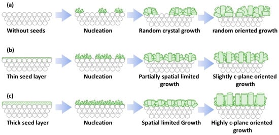 The mechanism of how the seeding and its amount effected the crystal orientation of the membrane may be explained as follows. When no seeds existed on the surface of the tubular substrate, the number of nuclei that nucleated on the substrate surface during the initial stage of hydrothermal synthesis should be small. Thus, the open space between each nuclei shall be large, leaving enough area for the nuclei to grow freely. This must have allowed crystal growth of h-WO3 crystals in random directions as shown in Figure 9a. When a thin seed layer exists, the nucleation should be slightly promoted and the number of nuclei crystallized on the substrate surface shall increase. Thus, the space between the nuclei shall become smaller and the growth of the h-WO3 pillars shall be disturbed by the neighboring crystals. Therefore, spatially limited growth must have partially took place, as shown in Figure 9b, resulting in a slight c-plane orientation. Furthermore, in the case of thicker seed layer, h-WO3 may be more likely to crystallize near the substrate surface during hydrothermal synthesis. The growth of the h-WO3 crystals comprising the membrane is almost limited in two dimensions due to the substrate, and neighboring crystals spatially limit the growth of rod-like crystals parallel to the substrate surface. Therefore, the crystals may have grown vertically to the substrate surface as shown in Figure 9c. In addition, because the seeds did not attach on the inner walls of the tubular substrate, the tungsten source in the precursor sol may have been selectively consumed at the outer surface of the tubular substrate, leading to increase in crystallization of neighboring crystals. This must have led to membrane formation with c-axes oriented vertical to the surface of the underlying substrate. Silicon stopper was applied hereafter to ensure efficient seeding, to prevent seeding on the inner wall of the tube, and to promote the c-plane orientation of the final membrane.