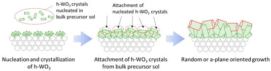 The reason why the amount of Na2WO4 in precursor sol affected the c-plane orientation of the membranes may be explained as follows. When the amount of Na2WO4 in the precursor sol was below 5.0 mmol, nucleation and crystallization of h-WO3 are expected to be mainly occurring near the seeds embedded on the tubular substrate surface. Numerous nuclei must have selectively grown vertically to the substrate surface due to the neighboring nuclei which limits the growth parallel to the substrate surface, as discussed in Figure 9 of Section 3.2. In contrast, when the amount of Na2WO4 in the precursor sol exceeded 6.0 mmol, nucleation and crystallization of the h-WO3 may have taken place primarily in the bulk precursor sol due to the high tungsten concentration. The h-WO3 crystals nucleated in the bulk precursor sol shall attach on the substrate surface and become incorporated into the h-WO3 membrane starting to grow on the surface of the tubular substrate as shown in Figure 13, thus decreasing the degree of c-plane orientation of the membrane. Furthermore, the number of nuclei generated in the bulk precursor sol is likely to increase as the precursor sol reaches closer to saturation and this must have led to attachment of more h-WO3 crystals from the bulk precursor sol onto the substrate surface. A precursor sol containing a moderate amount of Na2WO4, which is large enough to grow and densify the membrane but low enough to prevent vast nucleation and crystallization of h-WO3 in the bulk precursor sol, seems to be the key for realizing a h-WO3 membrane satisfying both high densification and high c-plane orientation.