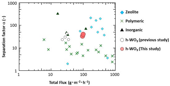 Performance of highly c-plane oriented h-WO3 membrane compared to our previous h-WO3 membranes and conventional membranes. (The open circles indicate the h-WO3 membranes reported in our previous study, reference [26]; the cross marks indicate performances of conventional polymeric membranes reported in references [29,30,31]; the triangle marks indicate performances of conventional inorganic membranes reported in references [32,33]; the diamond marks indicate the conventional zeolite membranes reported in reference [9,12,14,20,34,35].)