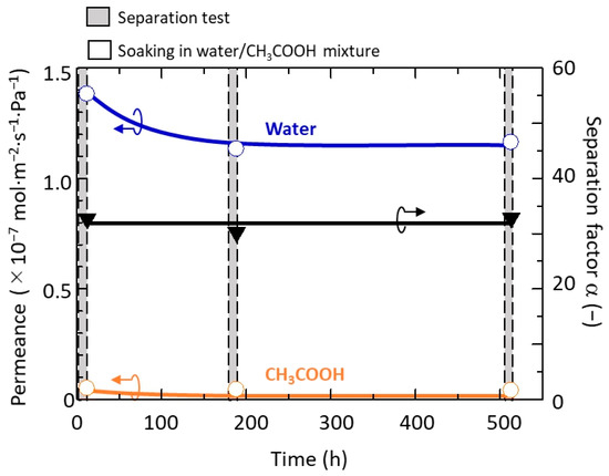 The stability of the h-WO3 membrane was evaluated by a long-term-separation test using the membrane synthesized with 3.5 mmol of Na2WO4. The PV performance of the membrane was repeatedly evaluated before and after storing in a 90:10 wt % CH3COOH/water mixture with a pH below 0 for a particular period at room temperature. The result is shown in Figure 15. Even after repeated testing for more than 500 h, the separation factor was maintained almost constant. Both water and CH3COOH permeance decreased by about 20% from the first test to the second test; however, the permeance was still high compared to our previous report [26] and maintained nearly constant thereafter for more than 300 h. This indicated that the h-WO3 membrane is durable against acidic solvents and that its performance can be maintained even during a long-term-separation test.