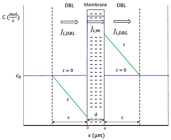 In Equation (3), Ti refers to the transport number of ions i in the membrane phase. To obtain the time evolution of the concentration in the two DBLs, the continuity equation was also considered: