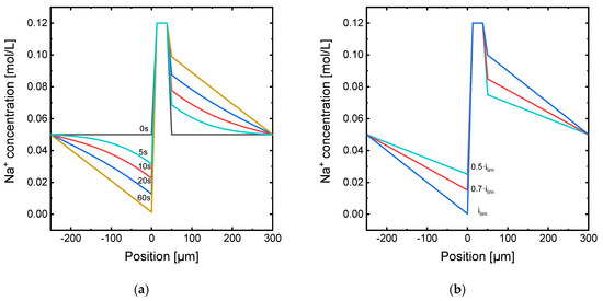 Na+ concentration profile along the diffusion boundary layers for the membrane system under: (a) application of ilim at different times; (b) application of different current densities once the steady state is achieved.
