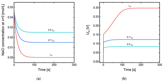 The evolution with time of the Na+ concentration at the depleting membrane-DBL interface for the system under the application of different values of current density is represented in Figure 4a. Here, it can also be seen that the concentration at the membrane surface reaches a value of zero when iop = ilim and the steady state is achieved. This result confirms that the simulation is consistent with the Peers’ equation. Figure 4b also shows the evolution of the voltage drop across the membrane system for the three values of applied current. Here, the initial jump in Um registered at the beginning of the simulation is approximately proportional to the applied current, as it is expected from a quasi-ohmic relationship between current and voltage when the influence of concentration polarization is still small. However, as the time increases, a jump in the Um value is registered before reaching a stationary value, especially for the ilim case. The time needed to reach the steady state also increases with the applied current: the value of Um reaches a constant value at around 50 s when 0.5·ilim is applied, while it needs more than 100 s in the case of ilim. From the results obtained with the continuous application of current, we can already expect that the implementation of current pulses will be more beneficial at high current densities, when the concentration profiles in the DBLs are more abrupt and the associated increase in Um is bigger.