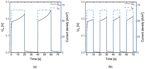 In the following section, a comprehensive investigation of the effect of the frequency and duty cycle of the pulses on the membrane voltage drop at different levels of pulse current density (ihigh) is presented. The values of current during the relaxation periods (ilow) were also investigated. It must be noted that the simulation time was adapted in order to compare the results for a value of transported charge equal to 16,800 A·s in all cases.