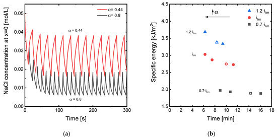 Some of the most representative results obtained by varying α are presented in Figure 8. For pulse periods with ton = 10 s, values of α higher than 0.5 imply pauses shorter than 10 s, while lower values of α imply extending the pause duration. Regarding the evolution of Na+ concentration at the diluting membrane–DBL interface (Figure 8a), higher duty cycles lead to a more intense depletion of the DBL, with concentrations at x = 0 oscillating around 0.01 mol/L when ihigh = ilim. On the contrary, a lower α value of 0.44 leads to Na+ concentrations at the membrane–solution interface oscillating around 0.025 mol/L. It can also be seen that the oscillation amplitudes become broader when α decreases, which is caused by the longer relaxation times leading to an enhanced restoration of the concentration profiles within the DBLs. Sosa-Fernandez et al. already demonstrated in a previous study, that extending the pause periods (toff values) during the desalination by PEF ED of polymer-flooding produced water yielded lower energy consumptions [16]. However, this reduction in energy consumption occurs at the cost of extending the time of operation significantly. Figure 8b shows the correlation between specific energy consumption and time needed to achieve a charge transfer of 16,800 A·s for different duty cycles. As found in previous works, decreasing α implies a decrease in the energy consumption, being this reduction more notorious at high current densities. On the contrary, for α values higher than 0.5, the times saved by decreasing the pause periods implied an increase in energy consumption. Thus, the application of asymmetric pulses can be used to obtain a trade-off between energy and time needed to desalinate a feed stream, being a useful strategy depending on the specific priorities of the given application of ED.