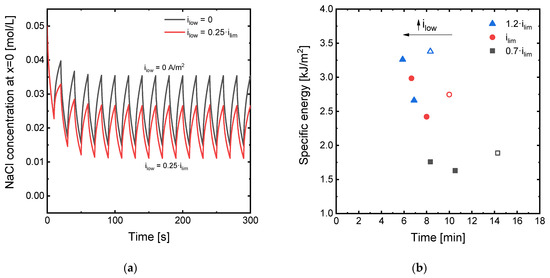 (a) Evolution with time of the NaCl concentration at the interface between the membrane surface and the diluting DBL (position x = 0) under the application of ilim in PEF mode with different values of ilow applied during the relaxation periods; (b) trade-off between the specific energy consumption and the time needed to achieve a charge transport of 16,800 A·s at different levels of current density with ton = toff = 10 s and varying values of ilow. Empty symbols represent the conditions for ilow = 0 A/m2.