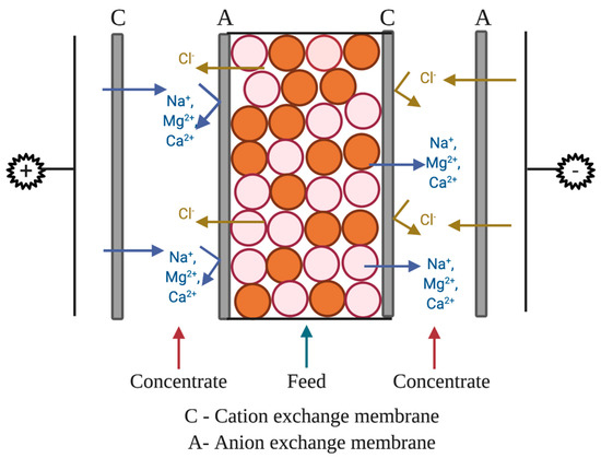 Electrodeionization (EDI) is a hybrid technology that is based on electrodialysis (ED), which employs electrical current and semi-impermeable membranes, and ion exchange (IE) that contains ion exchange resins [13] to overcome the disadvantages of both technologies such as concentration polarization, chemical regeneration [14], and excessive power utilization at low ion concentrations [15,16,17]. EDI can be operated in both continuous and batch modes and does not require a separate step to regenerate resins. Furthermore, EDI can work with low concentration streams with a lower power requirement compared to ED [15,16,18].