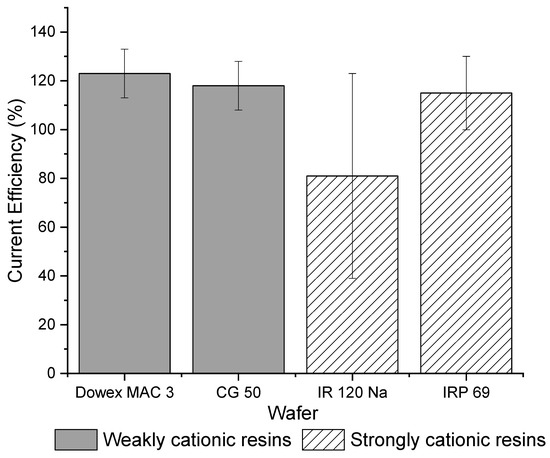 Figure 3 shows that the total current efficiency is similar between weak cation exchange and strong cation exchange wafers. The total current efficiency for each strong cation exchange resin wafer was close to 100% and for each weak cation, resin wafer was over 100%. While current efficiencies should be below 100%, other studies have previously reported efficiencies greater than 100%. Pan et al., showed that current efficiency increased in resin wafer EDI as the ion concentration in the dilute stream increased [20]. Luo and Wu [40] observed that the overall current efficiency of their system was greater than 100% at high concentrations. Lopez and Hestekin [29] reported that high ion diffusion during the experiment coupled with ion transport due to potential gradients can cause greater than 100% current efficiency. Another reason why these current efficiencies may exceed 100% is that the concentration of the solution in the dilute chamber is higher than in the concentrate chamber and therefore the electrically driven transport is being assisted by the concentration gradient. In this study, the strong cation exchange IRP 69 resin wafer had a current efficiency that was more consistently approximately 100% whereas the IR 120 Na+ wafer showed a lot of variabilities, which makes it less desirable for the selective removal of ions. In terms of the weak cation exchange resin wafers, both resin wafers showed similar average values and smaller variability in their current efficiencies.