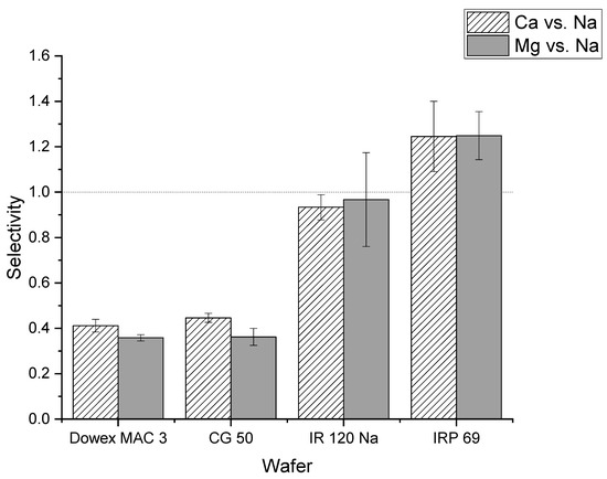 Comparison of selectivity values of calcium and magnesium relative to sodium for different strong cation exchange (IR 120 Na+ and IRP 69) and weak cation exchange (Dowex MAC 3 H+ and CG 50) resin wafers.