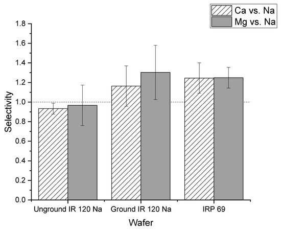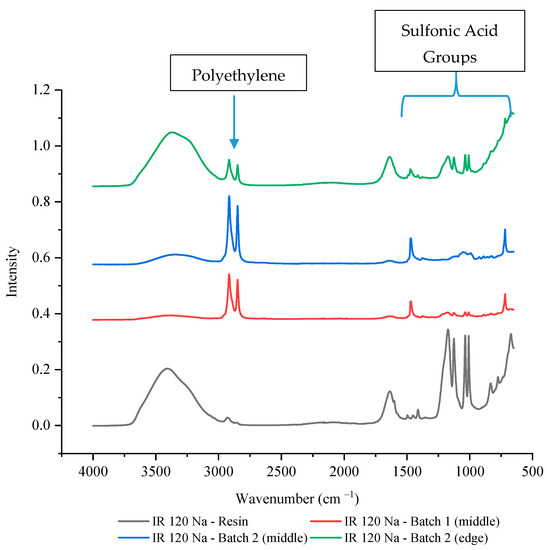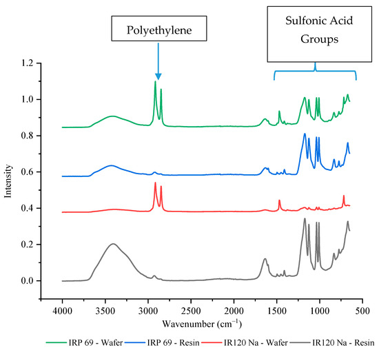 The IR 120 Na+ and IRP 69 resins have the same functional group of sulfonic acid which makes the resins strong cation exchangers. Since both resins had the same functional group, it was expected that their current efficiencies and selectivity values would be similar. However, it was observed that the IRP 69 wafer had a current efficiency that was consistently around 100% whereas IR 120 Na+ had a lower average value as well as a lot of variability, which made it less desirable for the selective removal of ions. Since these resins have the same chemistry, perhaps the difference in their performance was due to a variation in the accessibility of the active site. To better understand their differences, FTIR-ATR was performed. As shown in Figure 5, four peaks were observed between 1000 cm−1 and 1200 cm−1 that correspond to sulfonic acid functional groups. The peaks between 1030 to 1200 cm−1 have been previously reported to correspond to the symmetric and asymmetric stretching vibration of the −SO3− group of sulfonic acid [45]. The peaks at ~1000 cm−1 have been typically associated with an S-O stretch. While these groups were clearly present in IRP 69 wafer, their intensity was much lower in IR 120 Na+ wafer which indicated a significant decrease of the sulfur content and exposure of −SO3− groups. Specifically, in the IR 120 Na+ wafer, the intensity of the sulfonic acid peaks was around 10% of the resin’s value while for IRP 69 wafer the peaks were 65–70% of the resin’s value (exact values are provided in Supplementary Table S1). This could indicate that polyethylene is covering the IR 120 Na+ resin’s larger bead form and thereby decreasing the availability of the sulfonic acid functional groups. This may explain the high variability seen in the current efficiency and selectivity of the IR 120 Na+ wafer.