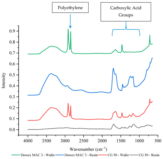 The weak cation exchange resins both have carboxylic acid functional groups which should have a peak between 1760 to 1690 cm−1 for the C=O stretch and a peak between 1320 to 1210 cm−1 for the C–O stretch [47]. Unlike the strong cation exchange resin wafers, the current efficiencies and selectivity values were similar between the two weak cation exchange resin wafers. However, the size of the cation exchange resins was also different between the Dowex MAC 3 H+ (bead form) and the CG 50 (powder form). As shown in Figure 7, the intensity of the carboxylic acid functional groups for powdered CG 50 resin was only about 20% of the intensity of the Dowex MAC 3 H+ bead resin. Once incorporated into a wafer, the Dowex MAC 3 H+ wafer had around 10% of the peak intensity of the resin alone (exact values are provided in Supplementary Table S2). For the CG 50 (powder) wafer, the wafer peak intensities were actually around 40–50% higher than the resin alone. As the CG 50 resin intensities were so much lower than the Dowex MAC 3 H+, it is possible that interference from other groups present in the wafer (from the polyethylene or anion exchange resin) led to the higher intensities.