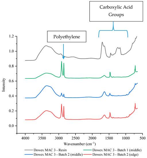 To confirm that the bead resins led to less availability of the function groups, two different batches and multiple wafer positions of Dowex MAC 3 H+ resin wafers were tested by FTIR-ATR. In both batches, the intensity of the carboxylic acid functional groups was significantly reduced at both the edge and the middle with intensity values of around 10–18% of the resin alone (Figure 8, Supplementary Table S2). It is interesting to note that this reduction did not appear to have any effect on the performance of the Dowex MAC 3 H+ resin wafer unlike what was observed with the strong cation exchange resin bead (IR 120 Na+).