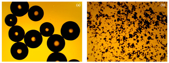 Optical microscopy images of (a) unground IR 120 Na+ resin and (b) ground IR 120 Na+ resin.