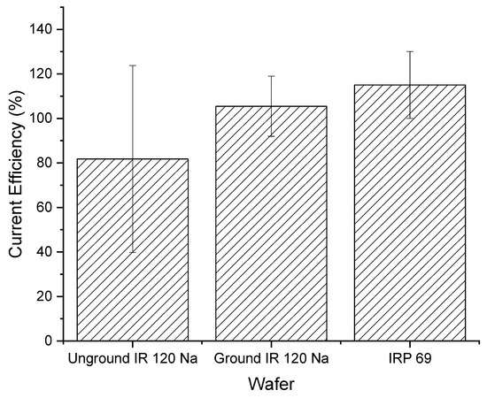 Figure 10 shows the ground IR 120 Na+ wafer had a higher and less variable current efficiency compared to the unground IR 120 Na+ wafer. In addition, the ground IR 120 Na+ wafer looked similar in performance to the powdered IRP 69 resin wafer. However, it is important to note that all the current efficiency values were statistically the same (p > 0.4).