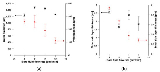 Figure 6a shows the effect of bore fluid flow rate on the outer diameter and wall thickness of hollow fibers spun from 20 wt% using water as bore fluid. With the increase in bore fluid flow rate, the outer diameter was slightly influenced, however, the wall thickness decreased significantly. Consequently, the inner diameter of hollow fibers increased with the increase in bore fluid flow rate. Wang et al. [39] observed the increased inner diameter and the reduced wall thickness of the as-spun polybenzimidazole (PBI) hollow fibers. Bildyukevich et al. [40] also found that the capillary diameter increased and wall thickness decreased with an increase in the rate of bore fluid at a constant polysulfone solution feed rate. This is due to the fact that the solidification rate at the inner surface increases with the increasing bore fluid flow rate since the mass transfer is facilitated. Therefore, an increase in bore fluid flow rate results in the increase in the inner diameter with a reduced wall thickness and slightly stretched outer skin [39]. As Figure 6b shows, the thickness of the outer skin layer was in the range of 1.5–2.5 µm, and the thickness of the inner skin layer decreased from 0.94 µm to 0.28 µm. The slight decrease in inner skin layer is due to the increased solvent–nonsolvent exchange rate resulting from the facilitated mass transfer. Figure 6c shows that hollow fibers spun from 20 wt% using various bore fluid flow rates possessed very high gas (N2 and CO2) permeance in the range of 4500–7000 GPU with no selectivity.