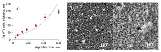 The change in wall thickness of silver microtubes (MTs) depending on the deposition time (a) and SEM images of the composites’ surface after 30 min (b) and 7 h of deposition (c).