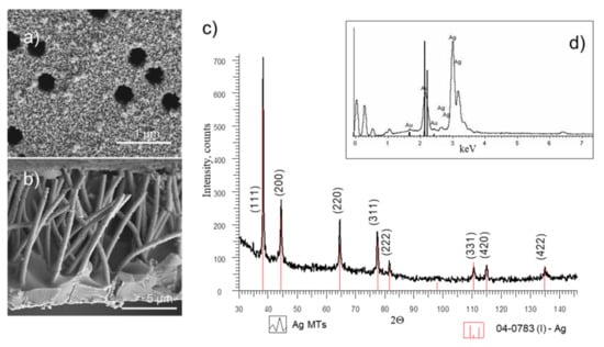 SEM images of the surface (a) and released individual Ag MTs (b), X-ray diffraction pattern (c), and energy dispersive X-ray spectrum (d) of the released silver MTs after removal of the polymer template.