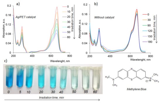 MB is a toxic phenothiazine cationic dye at high doses [50] used on an industrial scale for dyeing paper, cotton, wool, etc. [51]. MB decomposition is one of the most popular test reactions used as a reference in determining the photoactivity of semiconductor and nanoscale materials [52,53,54,55]. In this study, the effects of dye concentration, sample exposure time, and temperature on the catalytic activity of composite Ag/PET TeMs along with the stability of catalysts’ properties were investigated. Absorption spectra of aqueous MB solutions measured in the presence and absence of the composite catalyst at different times are presented in Figure 3a,b.