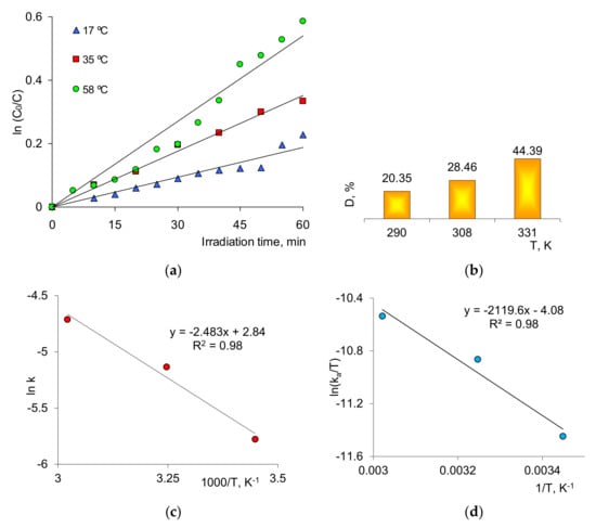 Efficiency of decomposition of MB (1.0 mg/L) in the presence of composite Ag/PET TeM at various temperatures (a,b). Arrhenius graph for determining Ea (c) and the Eyring plot for determining activation entropy (ΔS≠) and activation enthalpy (ΔH≠) (d).
