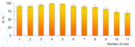 Change in the degradation efficiency D of MB (0.1 mg/L) dye for several consecutive runs.