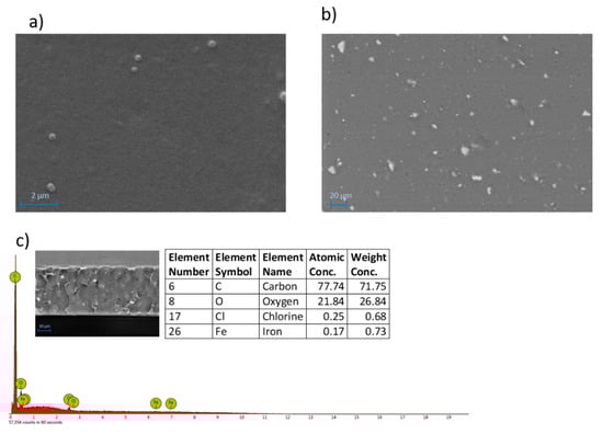 The surface morphology of the M3 membrane, (Figure 4a) which is representative of all the membranes prepared, presents a dense and compact surface. The addition of Fe-MOF-MW fillers was accompanied by the formation of small particles clearly visible on the surface as white spots (Figure 4b) by BSD analyses. The particles are in the form of small agglomerates ranging from about 1 to 10 μm and uniformly distributed on the membrane surface and along the cross-section (Figure 4c), which presented a dense and compact structure with an overall thickness of 34 ± 3 µm. EDX analyses, carried out along the membrane cross-section, detected the presence of Fe as the characteristic element of the MOF confirming their effective entrapment into the membrane matrix.