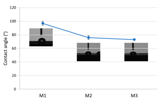 The results of contact angle measurements on three membranes are presented in Figure 5. The pristine PLA membrane M1 showed a contact angle of about 96°. Membranes containing the Fe-MOF-MW filler (M2 and M3) exhibited a decrease in the contact angle to 72° due to increased hydrophilicity. This effect can be related to the highly hydrophilic nature of MOFs, as reported in the literature [54].