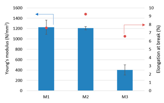 Figure 6 shows the results of the measurements of two mechanical properties of PLA membranes: Young’s modulus and elongation at break. For the pristine PLA membrane (M1) the results of the Young’s modulus and the elongation at break were 1200 N/mm2 and 8%, respectively. Addition of small concentrations of Fe-MOF-MW (0.1 wt%—M2) did not influence significantly the Young’s modulus, which can be explained by the good interfacial adhesion between the PLA polymeric chains and the MOF nanoparticles. The elongation at break of the M2 membrane was slightly increased by about 20% with respect to the M1 pristine membrane. This increase could be attributed to the presence of possible voids which improved the flexibility of PLA/MOF membranes as also observed by others [55,56]. However, a further increase in Fe-MOF-MW concentration (0.5 wt%—M3) caused a drop in Young’s modulus (about 400 N/mm2) and elongation at break (6.5%). This effect could be related to a higher agglomeration of MOF, which led to lower reinforcement of the PLA matrix [56].